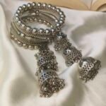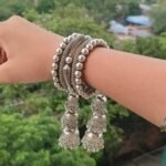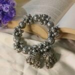 Where tradition meets timeless shine — Noor Jhumka Kada features intricately crafted oxidised beads in clustered elegance, finished with classic jhumka danglers. A perfect statement piece to light up your festive and ethnic looks.• Material: Premium oxidised alloy